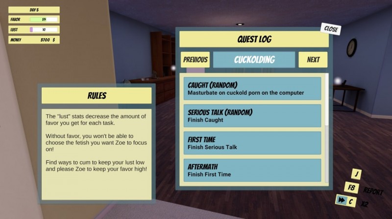 Многие постельные сцены включают интерактивные элементы, что позволят пользователю сменить ракурс, воспользоваться второстепенными инструментами, поменять темп и изменить другие аспекты процесса. Данный проект представлен в виде отдельного дополнения, где центральный персонаж находится в отношениях с девушкой Зоей и начинает новую жизнь. Сюжет повествует о том, как ванильный партнер становится доминирующим во всех аспектах отношений.