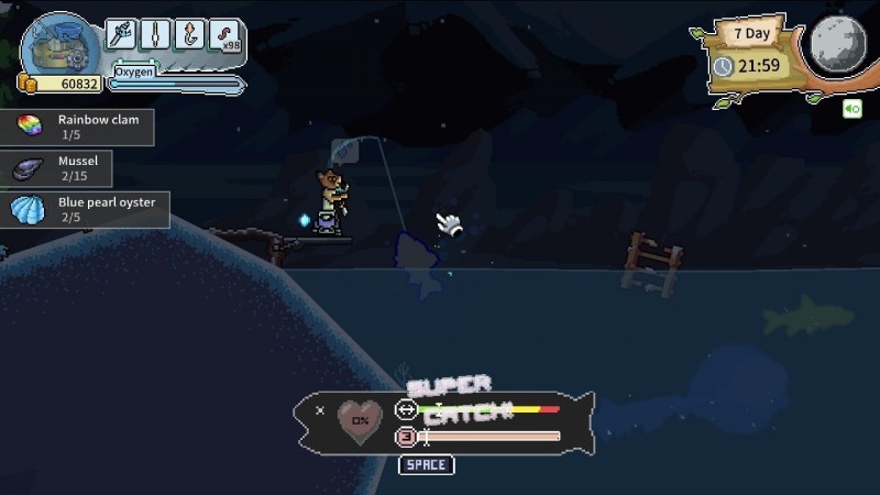 В самом начале игроки проходят нулевой уровень с обучением, где наглядно показаны особенности механики. Главная из них — рыбалка. Процесс происходит в режиме реального времени, где вы “заряжаете” шкалу силы перед забросом удочки, а после вовремя попадайте в скиллчеки и не допустите обрыва лески. Не забывайте проверять инвентарь на наличие свободного слота, иначе придется отпустить улов обратно в воду.